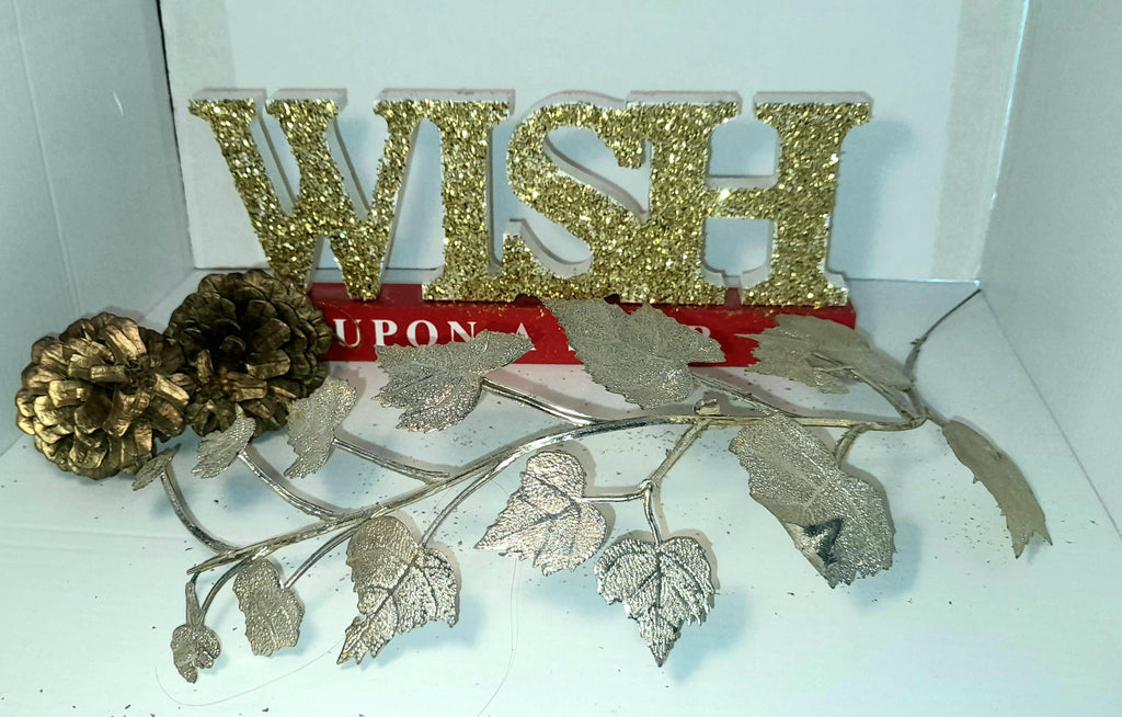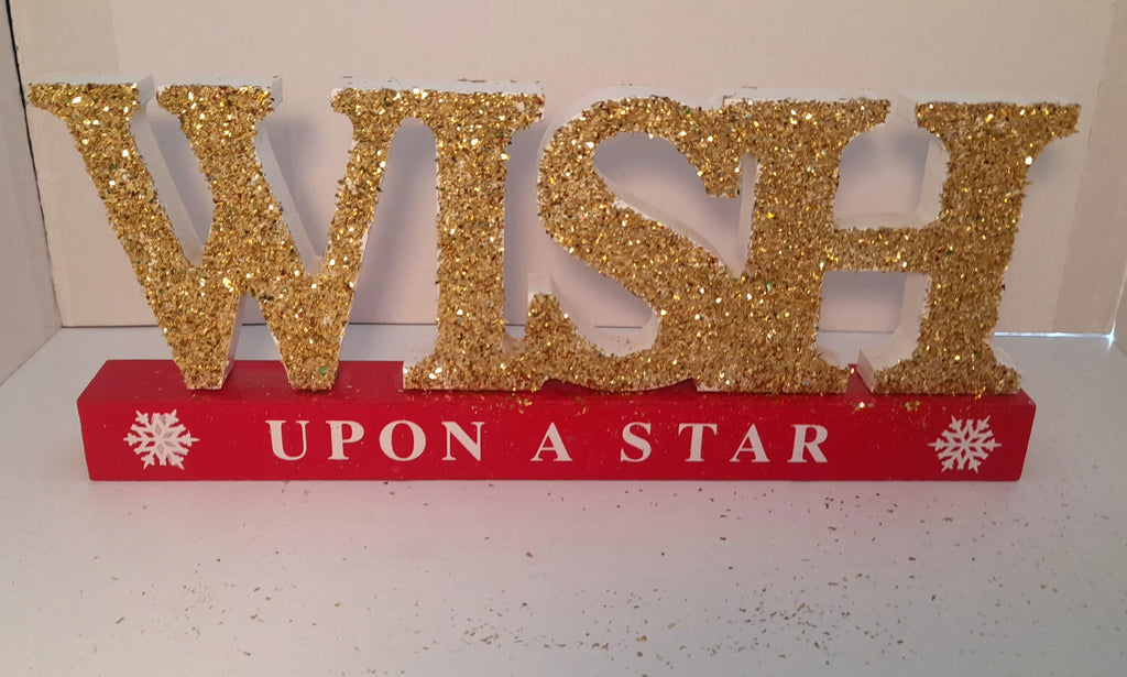 Wish upon a start Christmas decor plaque stand. Add some sparkle this Christmas with this wooden decor. Gold glitter wish free standing. Measures 26cmx 11cm x 2cm.